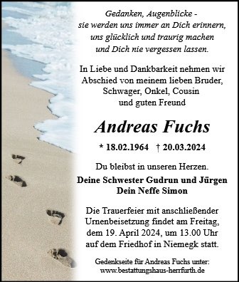 Ihnen herzlichen Dank für die würdevolle Trauerfeier für Andreas.