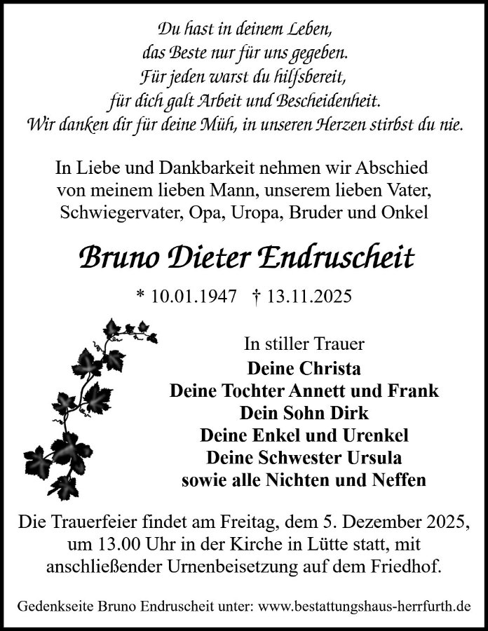 wir wünschen Ihnen für die kommende Zeit viel Kraft und dass es Ihnen gelingt, dankbar auf die positiven Erinnerungen zurückzublicken. Diese Gedenkseite möge Ihnen dabei helfen, Ihre Trauer zu teilen und das Andenken gemeinsam wachzuhalten.