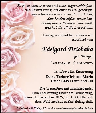 in diesen Tagen fühlen wir mit Ihnen und wünschen Ihnen von Herzen, dass Sie aus den glücklichen Erinnerungen Kraft schöpfen, um positiv in die Zukunft zu gehen. Diese Gedenkseite möge Ihnen dabei helfen, Ihre Trauer zu teilen und das Andenken gemeinsam wachzuhalten.