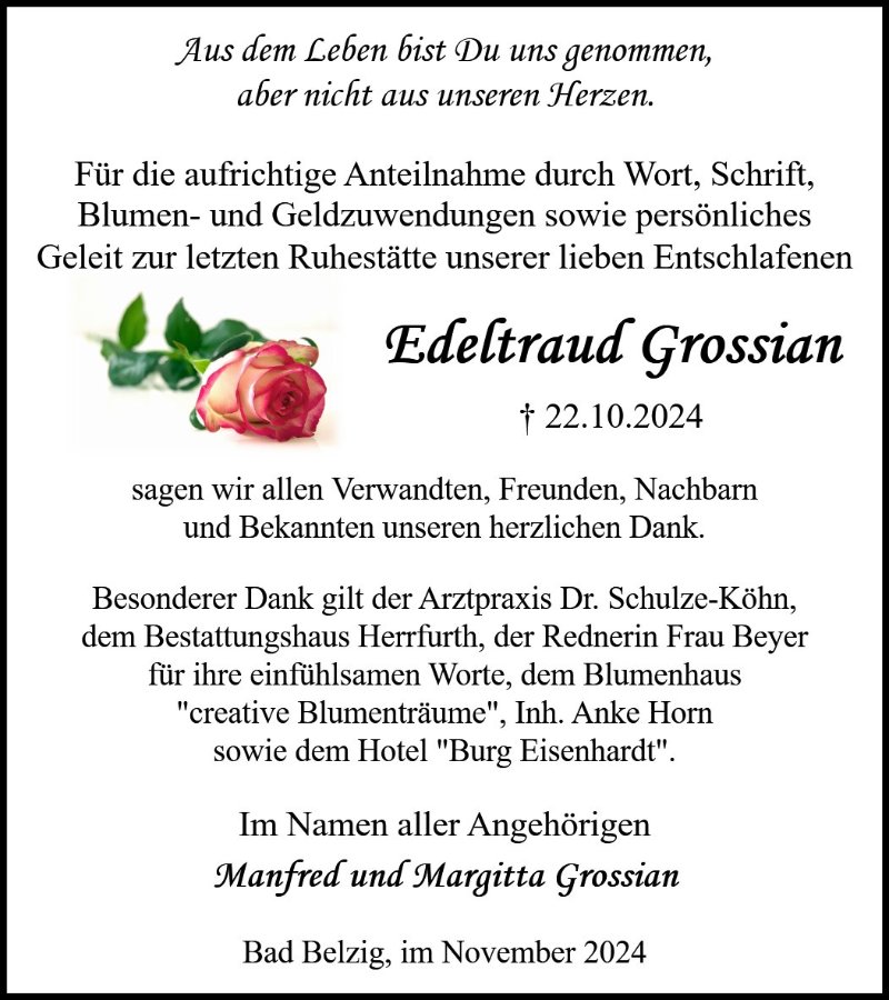 Aus dem Leben bist Du ,liebe T.Edeltraut, genommen aber nicht aus meinem Herzen.