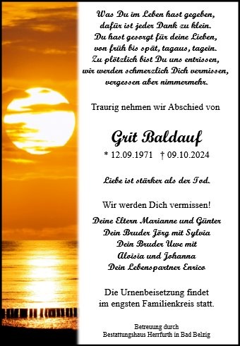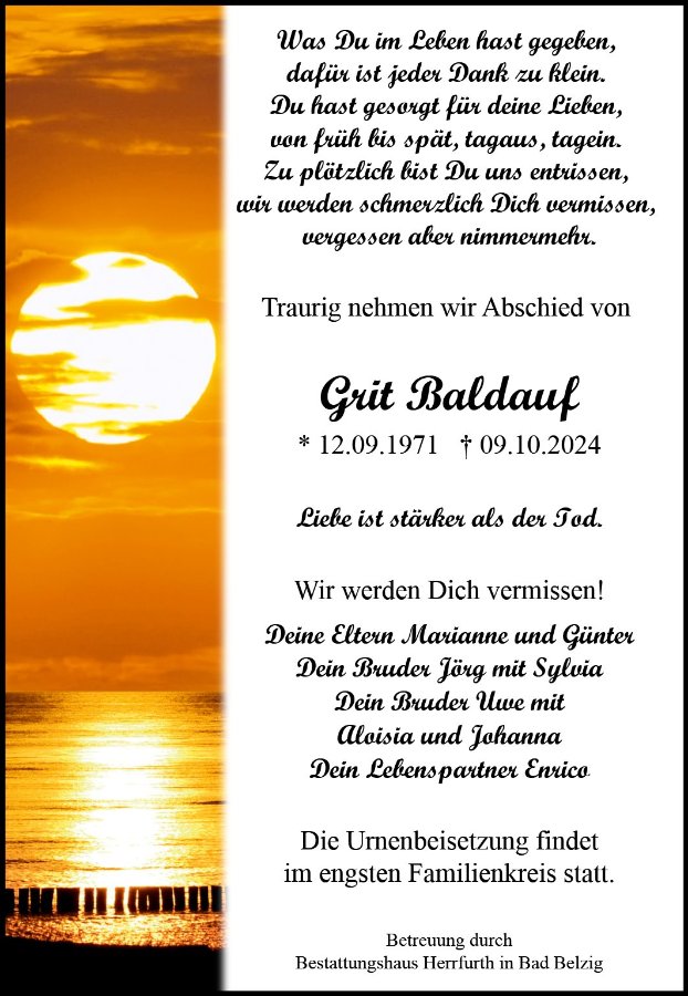 Mit großer Betroffenheit habe ich heute vom Tod von Grit erfahren. Grit war meine beste Freundin in Kindheit und Jugend. Später haben wir uns leider aus den Augen verloren. Ich wünsche der Familie in der kommenden schweren Zeit viel Kraft. Mit stillem Gruß Birgit