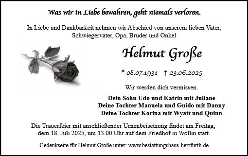 wir wünschen Ihnen von Herzen viel Kraft, dass Sie Menschen um sich haben, die Ihnen in dieser schweren Zeit beistehen und Halt geben. Zusätzlich können Sie auf dieser Gedenkseite Erinnerungen teilen und so das Andenken gemeinsam wachhalten.