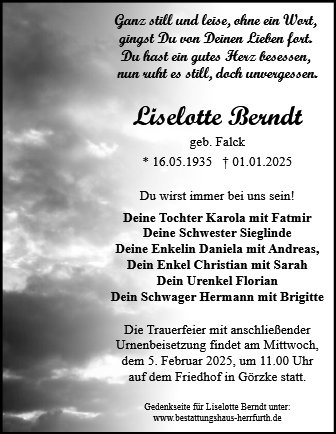 in dieser Zeit des Schmerzes wünschen wir Ihnen Kraft, den Verlust im Kreise Ihrer Liebsten zu verarbeiten. Als Zeichen unserer Anteilnahme und des Gedenkens entzünden wir dieses erste Licht. Möge diese Gedenkseite Ihnen helfen, Erinnerungen zu teilen und so das Andenken gemeinsam wachzuhalten.