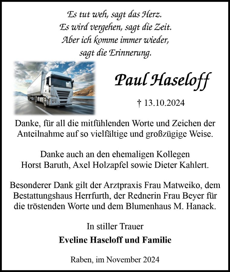 Tief betroffen erfuhr ich durch die Todesanzeige vom Ableben Ihres Mannes. Viele Jahre lang waren wir in der selben Klasse der Niemegker Schule. Bitte akzeptieren Sie auf diesem Wege mein aufrichtiges Beileid. Ich werde Paul in guter Erinnerung behalten.